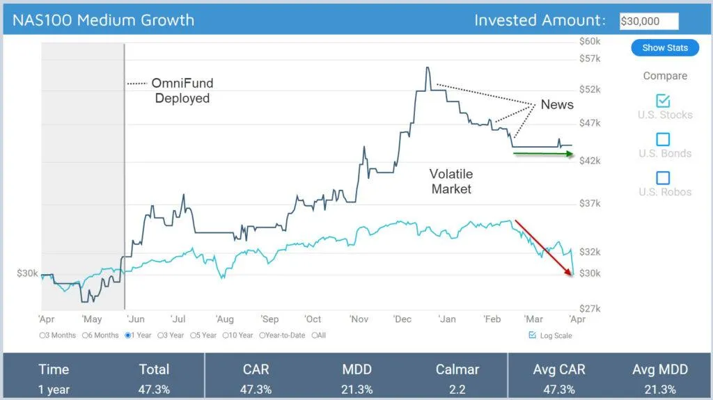 Unlike robo-advisors that typically invest in broad ETFs, OmniFunds uses advanced algorithms to select and trade individual stocks with strong growth potential. The system aims to actively manage risk while seeking higher returns than traditional passive strategies.